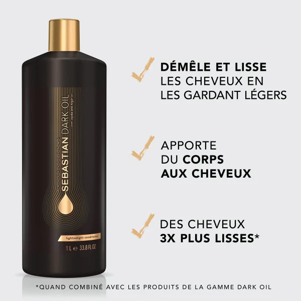 Conditionneur Léger Dark Oil Sebastian Professional, infusé d’un mélange spécial d’huiles d’argan et de jojoba. Il lisse et démêle les cheveux tout en leur offrant volume et légèreté.