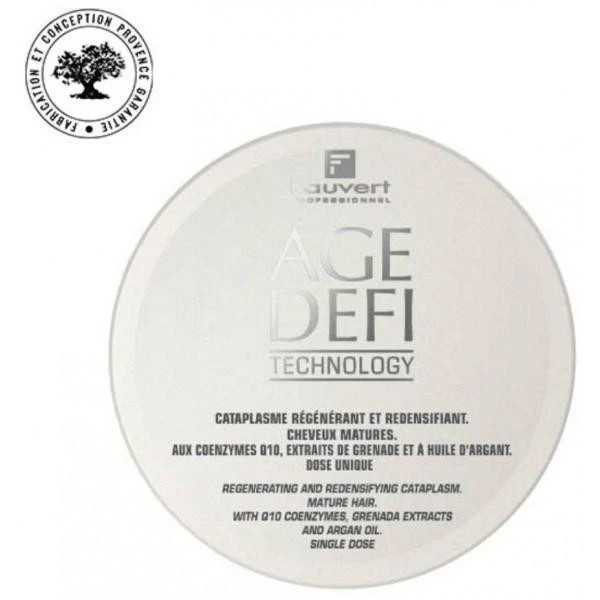 Cataplasme régénérant Age Défi Technology – Fauvert Professionnel. Ce cataplasme exclusif régénère en profondeur et redensifie les cheveux en perte de substance et de vitalité. Sa formule aux coenzymes Q10+, aux extraits de grenade et à l’huile d’argan permet une régénération puissante et profonde du cheveu, mais aussi du cuir chevelu.