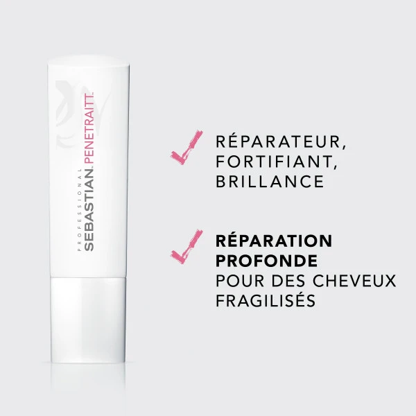 - Shampooing pour cheveux abîmés Pentraitt 250ml. Lavez et fortifiez les cheveux abîmés avec le shampooing Penetraitt de Sebastian Professional. Le système réparateur de ce produit capillaire professionnel pénètre en profondeur dans le cheveu, éliminant ainsi les impuretés tout en fortifiant les cheveux. Le shampooing réparateur de Sebastian fortifie les cheveux fragilisés par les traitements chimiques, la chaleur et les éléments environnementaux. Pour des cheveux propres, doux et volumineux. Recommandé pour apporter de la brillance et de l’intensité aux cheveux colorés.