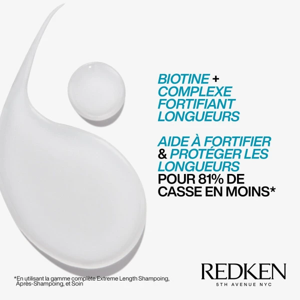 Le saviez-vous ? Des cheveux en bonne santĂ© gagnent entre 6 et 15cm de longueur par an. Pour eux, Redken créé la routine Extreme Length qui protĂ©gera les cheveux longs et leur permettra de gagner un maximum de centimètres : jusqu’Ă 15 cm de croissance en un an. La routine shampooing, après-shampooing et soin sans rinçage Extreme Length, c’est 81% de casse en moins et 78% moins de fourches visibles.