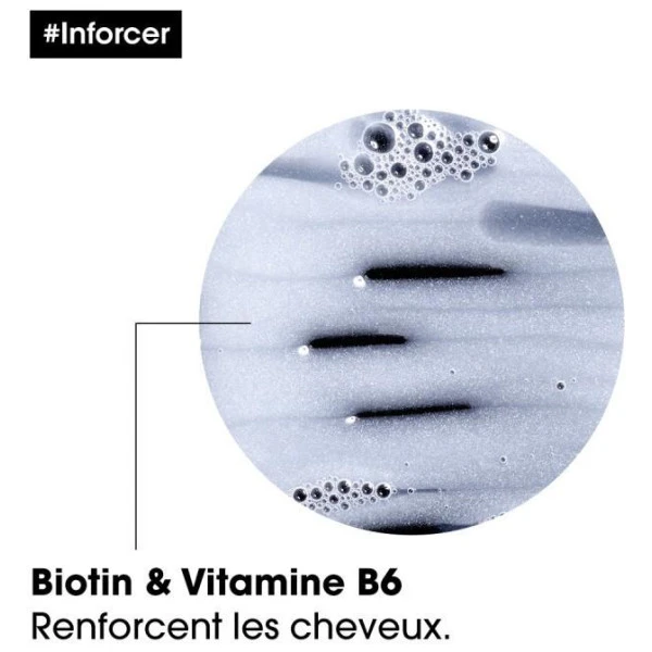 Le shampooing Inforcer Série Expert de L’Oréal Professionnel est conçu pour répondre aux besoins des cheveux abimés, secs et cassants. Sa mission ? Débarrasser le cuir chevelu et les longueurs des impuretés accumulées tout au long de la journée tout en redonnant aux cheveux la force qu’il leur manque. Formulé à partir de vitamine B6 et en biotine, l’utilisation fréquente du shampooing Inforcer nourrit le cheveu sans l’alourdir. La fibre capillaire est soignée, plus élastique, et donc moins sujette à la casse. Les vitamines B6 accélère la production de kératine et favorise une croissance saine du cheveu.