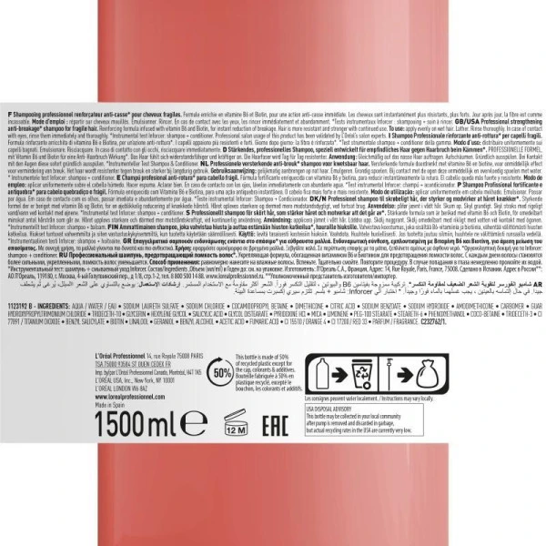 Application : Sur cheveux mouillés, appliquez le shampooing Inforcer Serie Expert sur l’ensemble de la chevelure. Émulsionnez du bout de doigts. Massez délicatement le cuir chevelu et les longueurs. Rincez à l’eau. Répétez si nécessaire. Terminez par un jet d’eau froide pour plus de brillance.