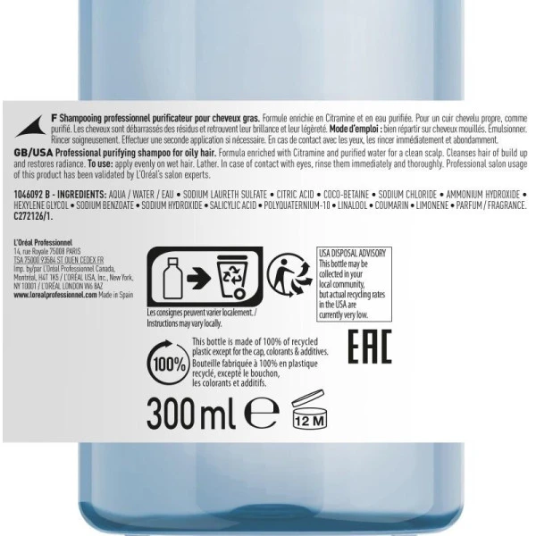 Application : Sur cheveux mouillés, appliquez le shampooing Pure Ressource de L’Oréal Professionnel. Massez délicatement le cuir chevelu avec la paume de main pour vous débarrasser de toutes les impuretés sans stimuler la production de sébum. Rincez à l’eau. Répétez l’opération si nécessaire. Complétez avec un soin Serie Expert adapté à vos longueurs (cassantes, colorées etc).