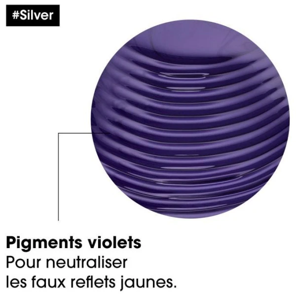 Shampooing Silver L’Oréal Professionnel, l’alliance incroyable de pigments violets et de magnésium acétate pour neutraliser les reflets jaunes des cheveux gris.
