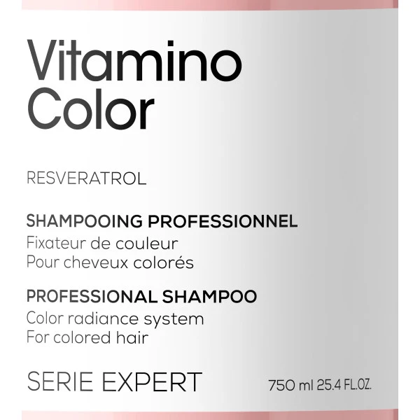 Conçu pour répondre aux besoins des cheveux colorés, le shampooing professionnel Vitamino Color Série Expert de L’Oréal Professionnel est formulé à base de Resveratrol, un fort polyphénol qui évite l’affadissement de la couleur et les dommages de la fibre capillaire suite à un service technique. Le Resveratrol garantie également une protection UV contre les rayons du soleil, souvent à l’origine de l’affadissement d’une coloration. La texture onctueuse et la mousse aérée du shampooing Vitamino Color feront de votre douche un réel moment détente.