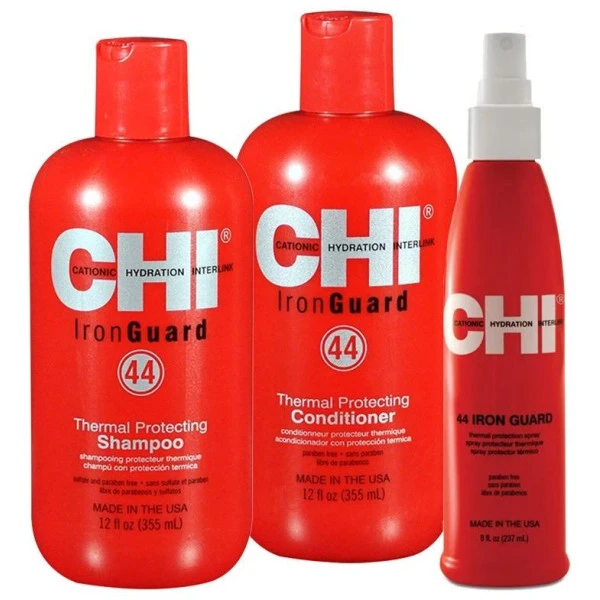 - Le shampooing 44 Iron Guard de CHI nettoie les cheveux avec douceur et les débarrasse des impuretés accumulées au cours de la journée. Sa formule offre à la chevelure un coup de boost en lui procurant des vitamines A et E et des protéines. Ces actifs vont venir renforcer la fibre capillaire, la nourrir et la préparer à l’utilisation des appareils chauffants électriques. Il nettoie délicatement, renforce avec des vitamines A et E et des protéines, nourrit la fibre et protège de la chaleur des appareils électriques.